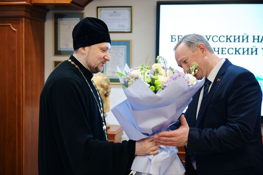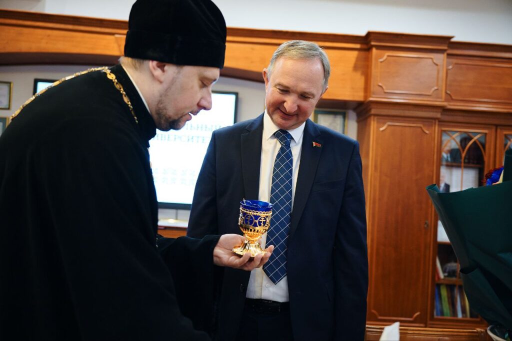 Председатель Правления Христианского образовательного центра им. свв. Мефодия и Кирилла священник Святослав Рогальский вручил по случаю юбилея ректору БНТУ Грамоту Христианского образовательного центра, а также передал лампаду в открытый 10 декабря университетский духовно-просветительский центр.